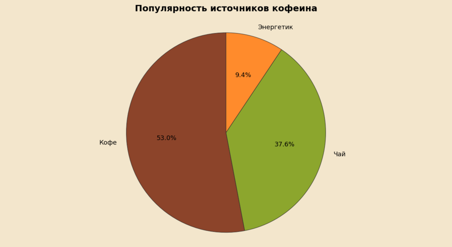 Второе место по популярности занимает чай (примерно 37,6%). Это говорит о том, что значительная часть людей предпочитает более мягкий и спокойный источник кофеина, который часто воспринимается как более полезный и менее вредный для сна и самочувствия.