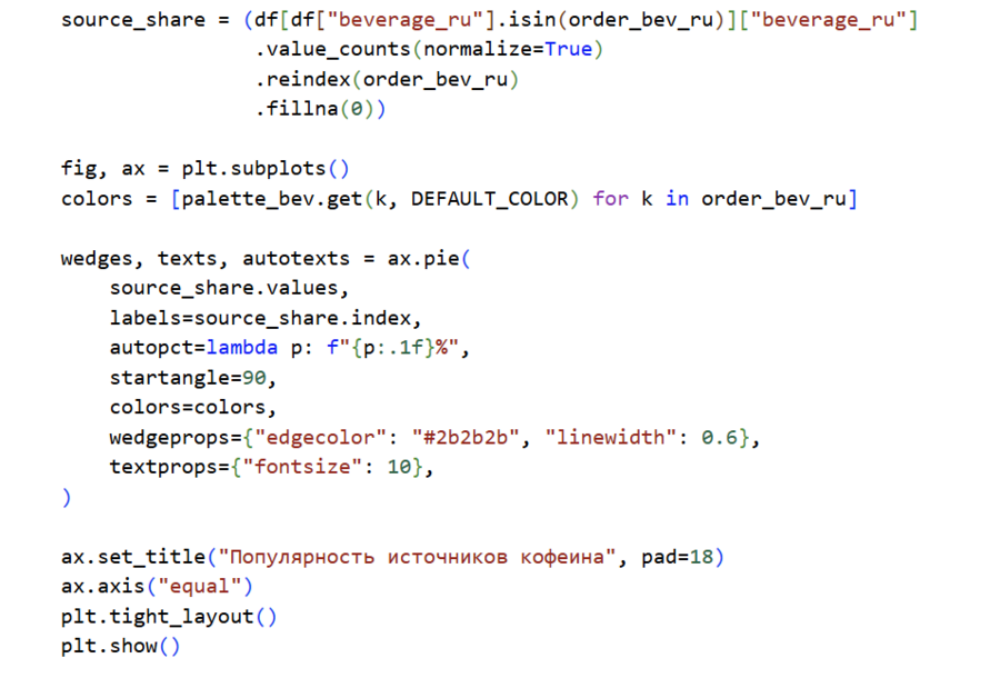 9. Подготовила палитры цветов для категорий (palette_bev, time_palette, gender_palette) и дефолтный цвет.