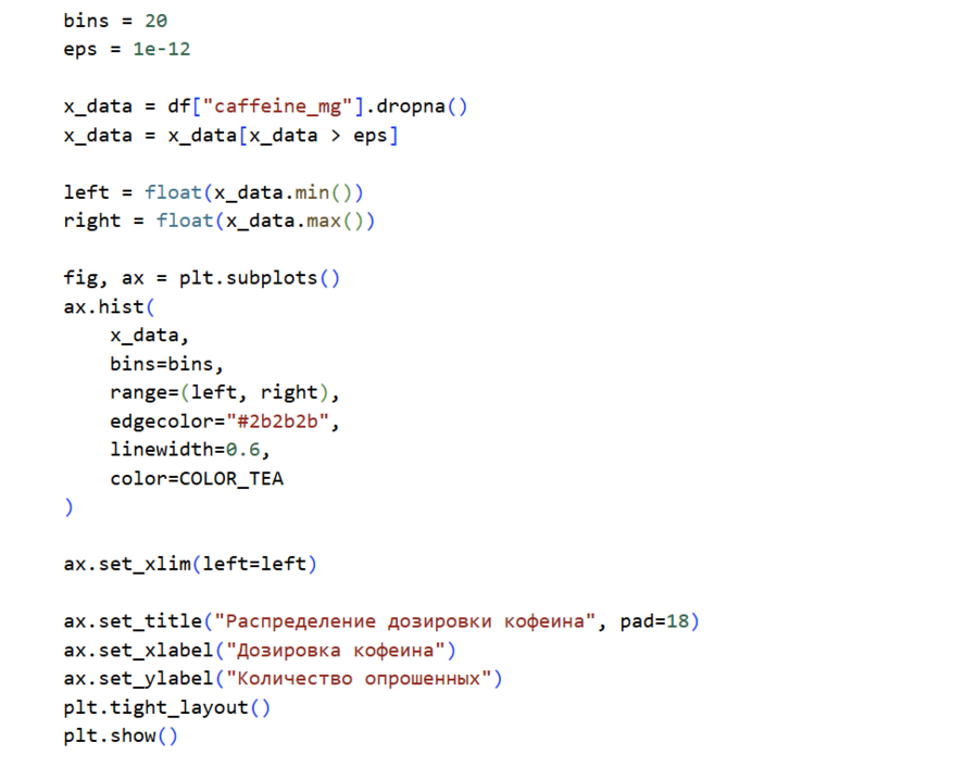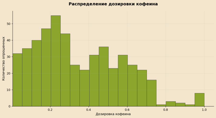 Почему выбрана: отражает реальные объёмы потребления кофеина, позволяет увидеть, преобладают ли безопасные или потенциально рискованные дозы. Тип графика: гистограмма — хорошо подходит для анализа распределения количественных данных.