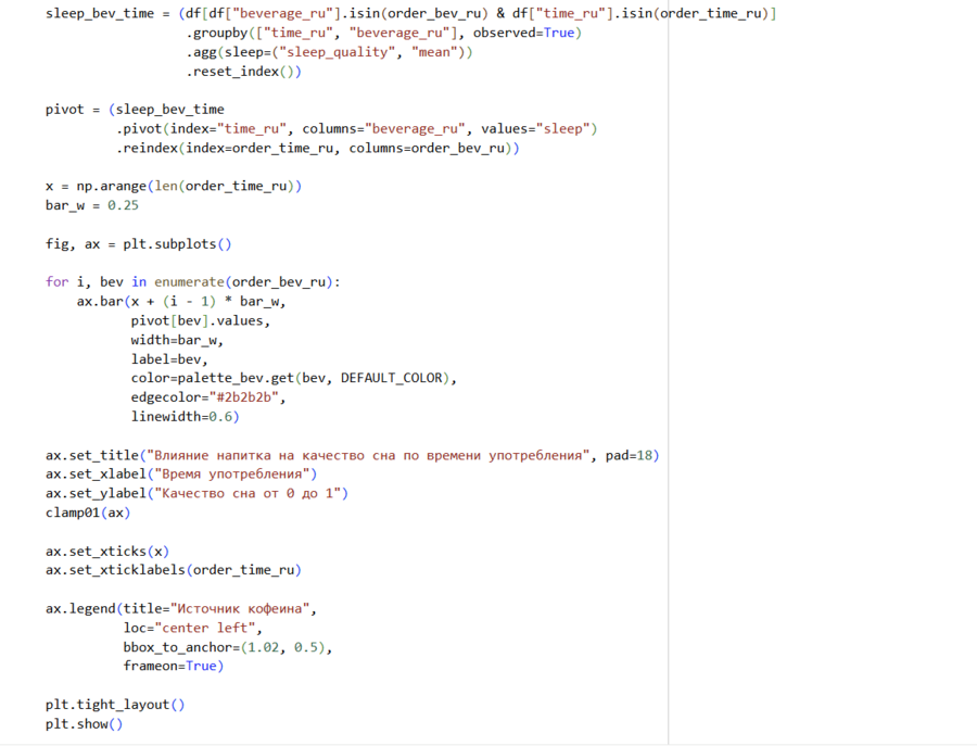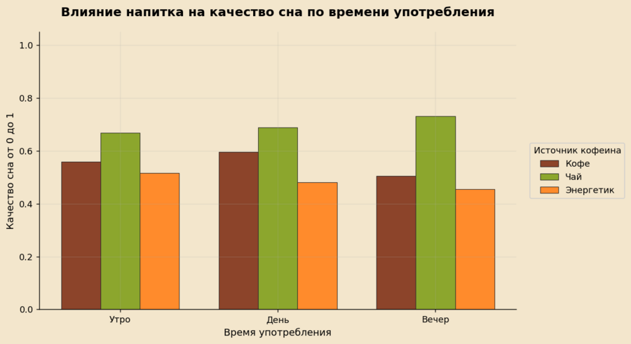 Почему выбрана: учитывает не только источник кофеина, но и момент его приёма, помогает оценить негативные последствия употребления кофеина, особенно вечером. Тип графика: группированная столбчатая диаграмма — позволяет одновременно сравнивать несколько факторов.