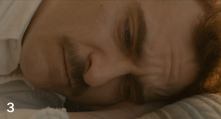 Показательным является диалог героев в лесном домике, он очень насыщен как эмоционально, так и с точки зрения монтажа. Беседа начинается с общего плана, затем переходит на средний, и на протяжении нескольких итераций происходит что-то вроде восьмерки, только сфокусированной на одном персонаже. Грамотной передаче в данном случае способствует так же правильное и постоянное направление взгляда Теодора.