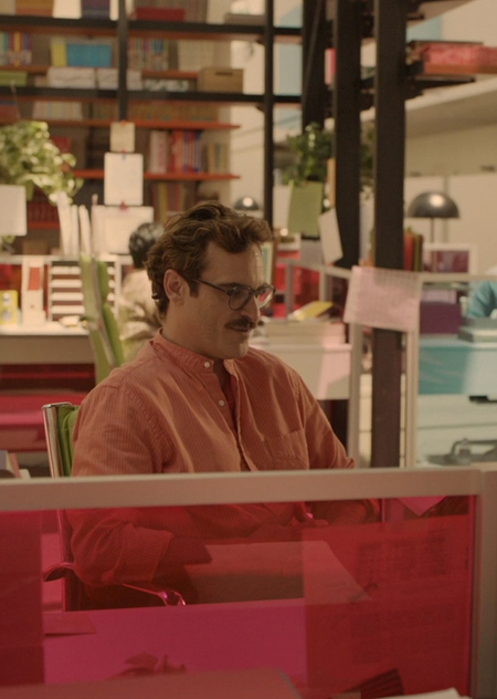 За весь фильм можно встретить буквально пару сцен, в которых мы видим главного героя в рубашке холодного цвета. Один случай является флэшбеком его ссоры с бывшей женой, а другой — горьким финалом достаточно экспериментального и неприятного для Теодора «свидания» с Самантой, которое она придумала.