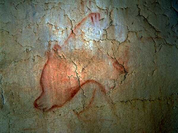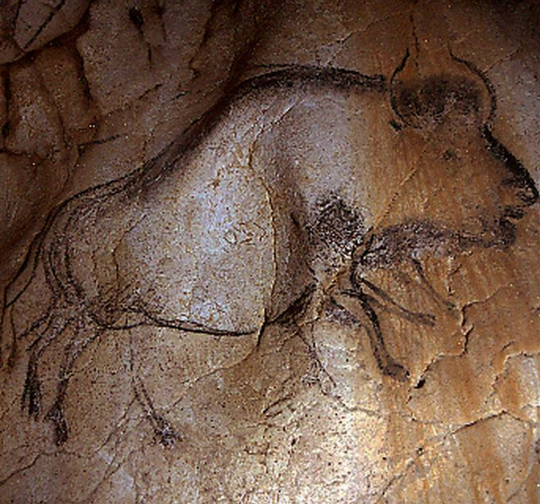 В пещере Альтамира, в ее «большом зале», можно увидеть пару бизонов. Художник умело использовал цвет: разные оттенки красного создают ощущение объема и движения, а четкий черный контур придает рисунку реалистичность.