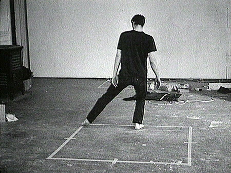 На полу мастерской вычерчен квадрат размером приблизительно 4×4, и по периметру этого квадрата Науман медленно идет, аккуратно переставляя ноги, и каждый шаг акцентируется преувеличенной постановкой плеч и бедер.
