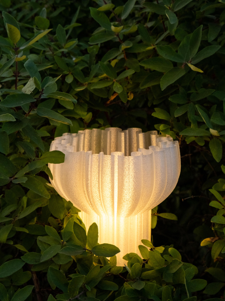 Eco Production. This object is printed on a 3D printer using FDM technology. PLA plastic is manufactured out of a Plant-based material (corn in our case). Such plastic decomposes in the ground into organic matter (not microplastic) within 10 years. PLA plastic is strong and has almost no shrinkage when it cools. This helps maintain geometry and print very complex shapes without scrap or cracks. 3D printing technology allows us to print the lamp on demand — thus avoiding overproduction.