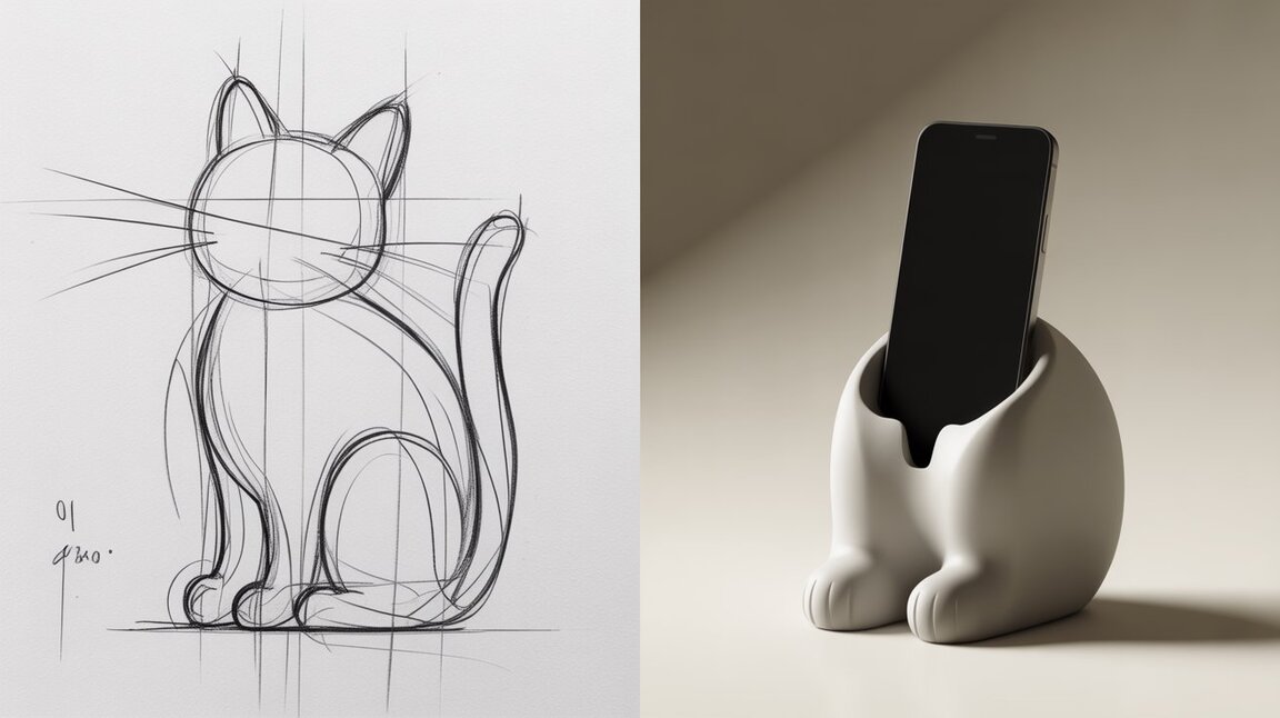 Последовательность: Создание эскизов и выбор позы кошки. Моделирование 3D объекта с учетом угла подставки под телефон. Экспорт модели в STL. Настройка печати в слайсере: ориентация, слои, поддержка. 3D печать подставки. Очистка, снятие поддержек, шлифовка. Покраска/лакировка (опционально). Фотосессия готовой модели для промо-материалов.