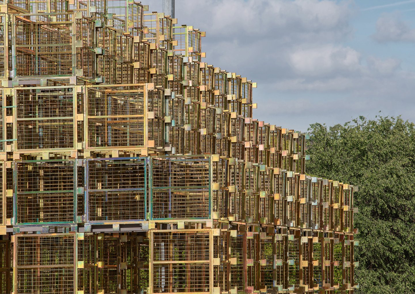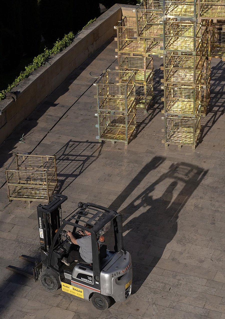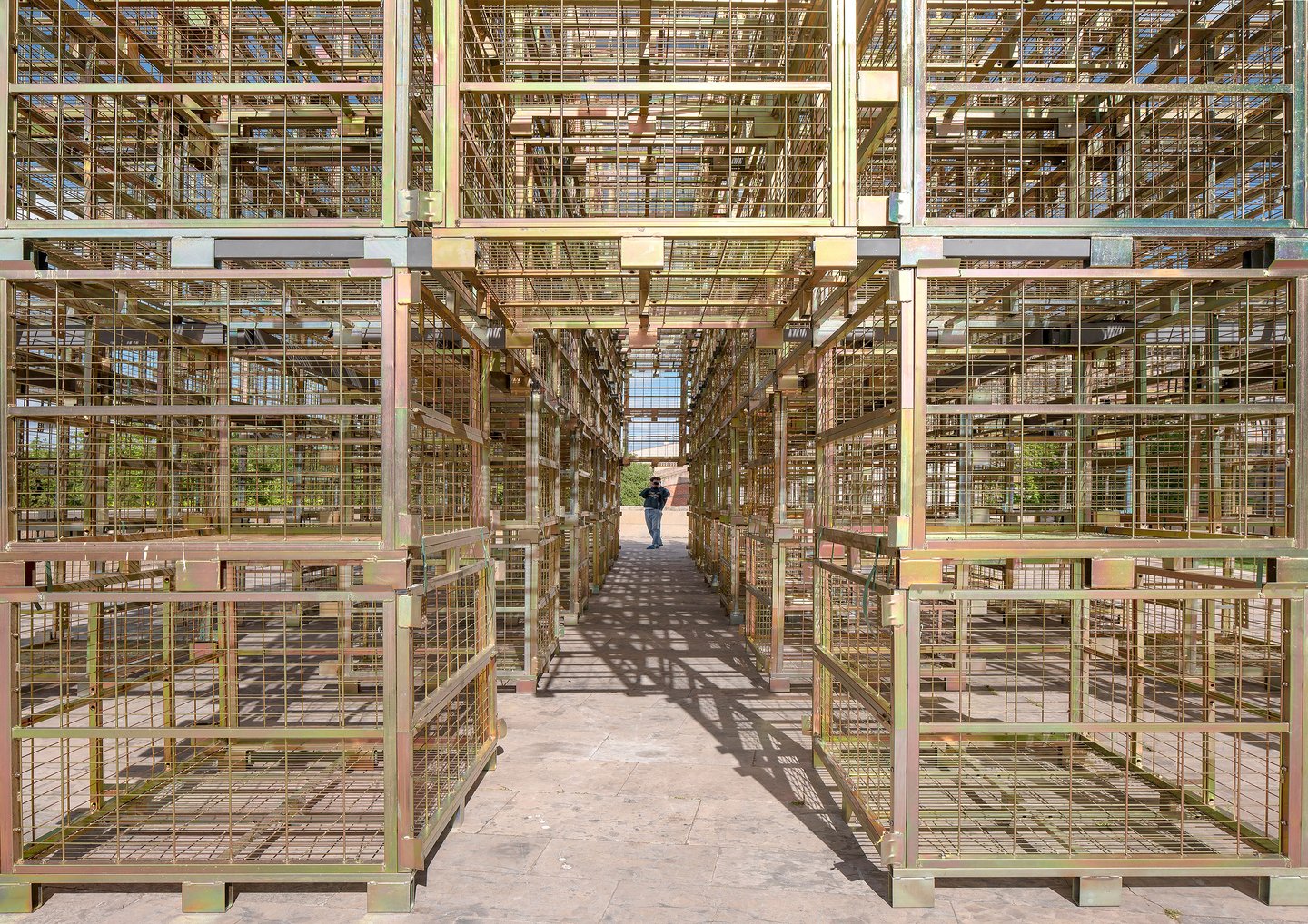 With its stepped roof, the pavilion typologically resembles an agricultural shed and a traditional basilica, referring to both productive/labor and social/spiritual practices. Placed on a platform next to the Church of Santiago el Real, it offers shade and a place for gathering. Golden meshes of the cages create an intricate play of light and shadows and transform the space into a maze of dematerialized rooms.