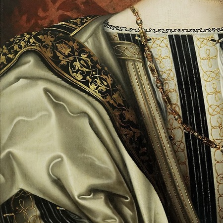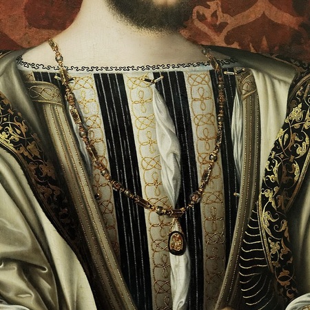 Левый участок показывает рукав и плащ Франциска I, где художник достигает почти иллюзорного эффекта: кажется, что ткань действительно переливается и двигается под светом. Бархат и шёлк переданы с предельной точностью, на поверхности появляются мягкие блики и тени. По краю виден узор из золота на чёрном фоне это сложная вышивка, образующая декоративный ритм. Такая отделка была признаком исключительного статуса, ведь золото и чёрный цвет считались сочетанием власти и благородства.