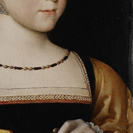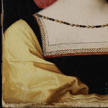 Руки Шарлотты написаны аккуратно и спокойно. Пальцы лежат расслабленно, без напряжения, что подчёркивает сдержанный характер изображения. Белый манжет с небольшой складкой создаёт контраст с тёмной тканью платья и делает композицию более яркой. В сочетании с чётками жест выглядит естественно и показывает воспитание, которое предполагало сочетание религиозных привычек и придворной нормы поведения. Этот фрагмент показывает, что даже маленький аксессуар мог служить знаком статуса и воспитания ребёнка при дворе Франциска I.