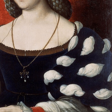 Такая конструкция свидетельствует о моде французского двора и подчеркивает высокий социальный ранг модели. Клуэ уделяет особое внимание рисунку плетений и мелким жемчужным вставкам, что демонстрирует характерный для мастера интерес к текстуре и материальности.