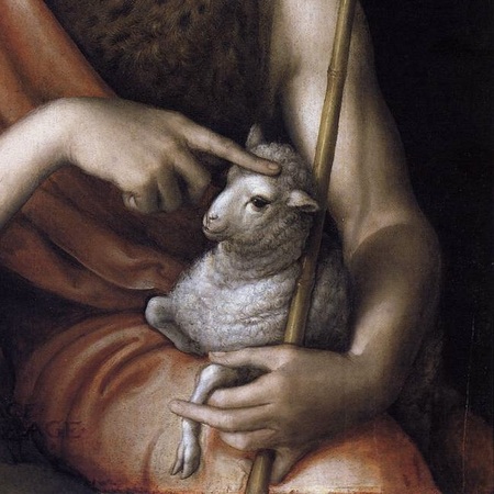 В левом фрагменте художник показывает традиционный символ Иоанна Крестителя и это ягненок.