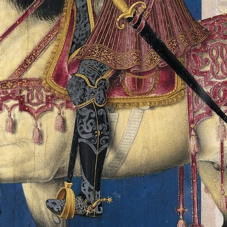 Попона лошади образует самостоятельный декоративный пласт, где художник демонстрирует сложный орнаментальный язык придворного искусства. Красно-розовая ткань покрыта системой переплетающихся мотивов, напоминающих позднеготические и раннеренессансные узоры, характерные для придворных мастерских Франции. Золотые нити и точечные акценты создают эффект рельефности, а бахрома с кистями подчёркивает движение и вертикальный ритм. Попона спускается почти до колен лошади, что указывает на её парадное назначение. Подобные украшения использовались исключительно в торжественных выездах и церемониях.