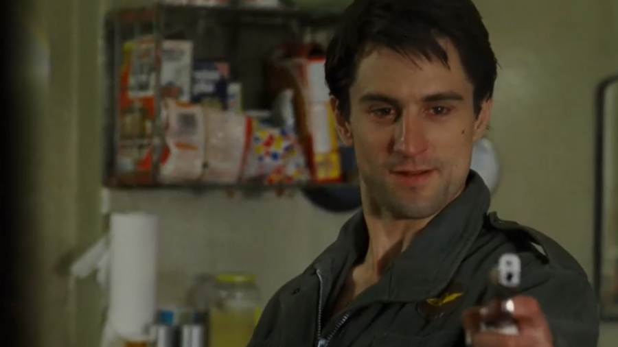 Трэвис Бикл стоит перед зеркалом с пистолетом и отрабатывает агрессивные жесты, но важен не сам монолог «You talkin’ to me?», а то, как он взаимодействует с собственным отражением. Зеркало превращается в экран, на который Трэвис проецирует вымышленную версию себя — более сильную, решительную, опасную. Герой не просто «смотрит» в отражение: он наблюдает роль, которую стремится сыграть в реальности.