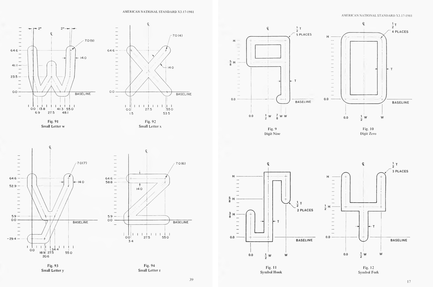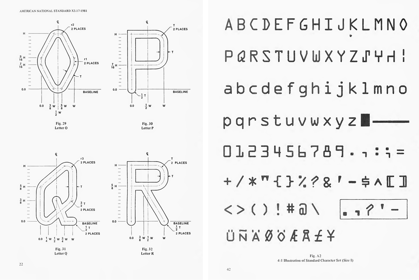 OCR-A (1966) — один из первых шрифтов, созданных специально для оптического распознавания. Его конструкция подчинялась не типографической традиции, а алгоритмам машинного считывания, поэтому форма букв была рассчитана по строгим геометрическим правилам. Каждая литерa строилась на модульной сетке с жёстким ограничением на количество кривых: в идеале — ни одной, допускаются только прямые линии, прямоугольные углы и дуги крупного радиуса. Это минимизировало риск ложных срабатываний в ранних системах OCR, которые анализировали контуры символов по набору фиксированных опорных точек.
