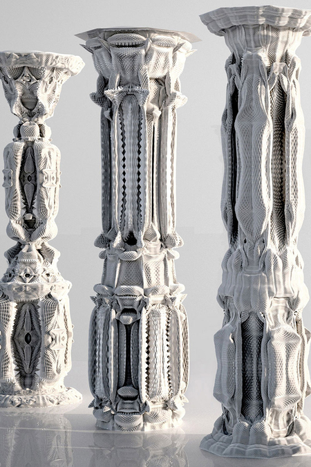 Для создания работы «Subdivided Columns» Майкл Хансмейер использует свои собственные генеративные программы. Он пишет программу, которая генерирует процесс создания колонны, тем самым создавая вариации, которые художник мог не подразумевать.