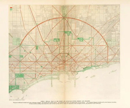 План Чикаго, план системы улиц и бульваров. 1909 г. / План Чикаго, вид на город на запад. 1909 г.