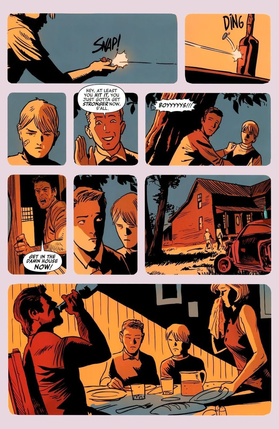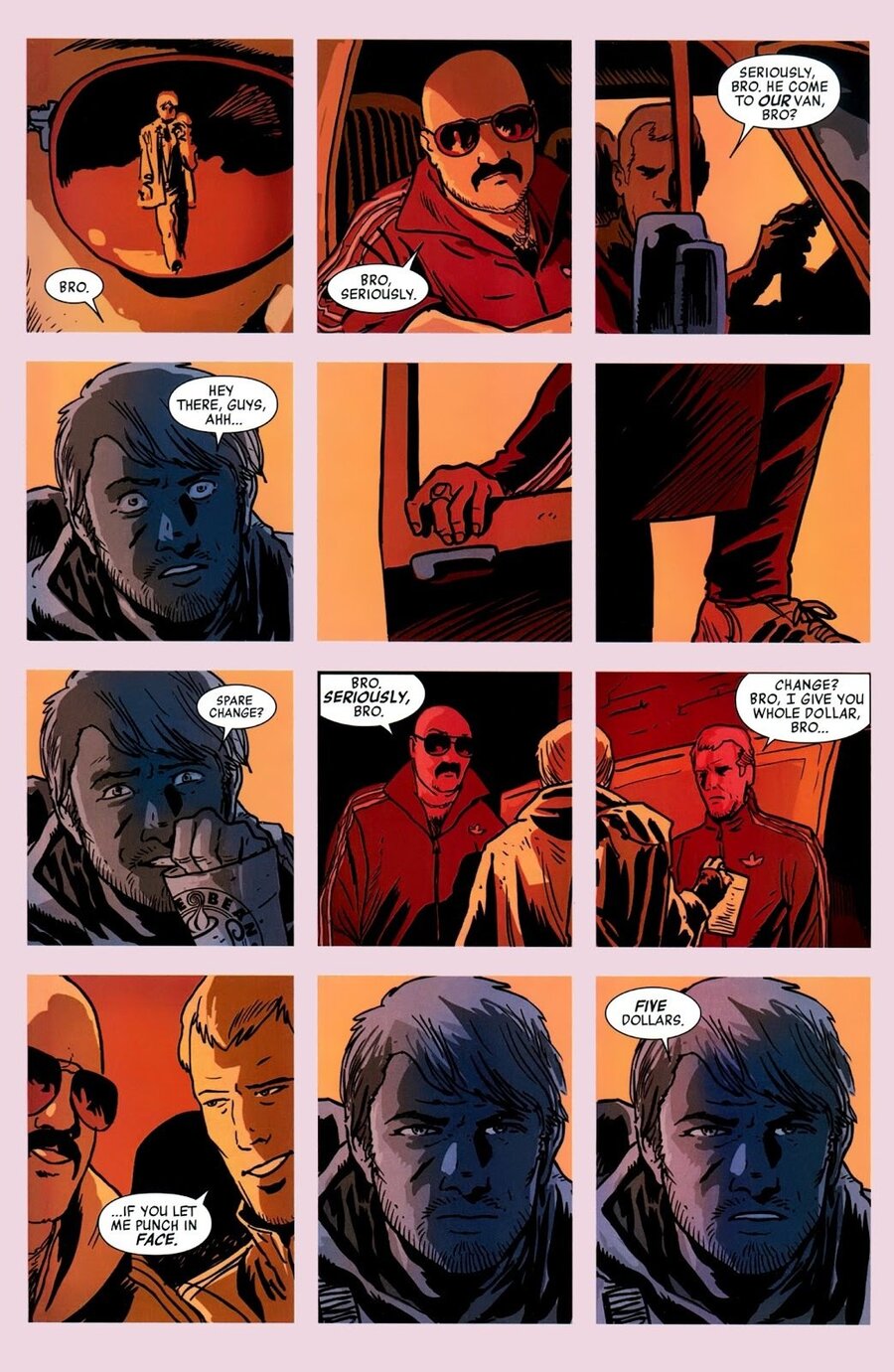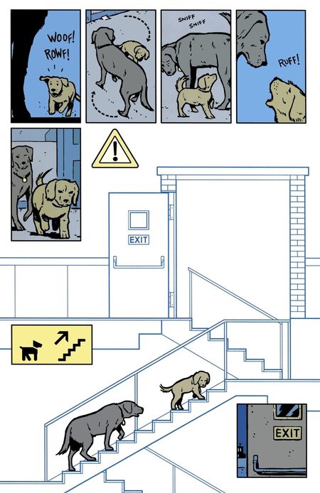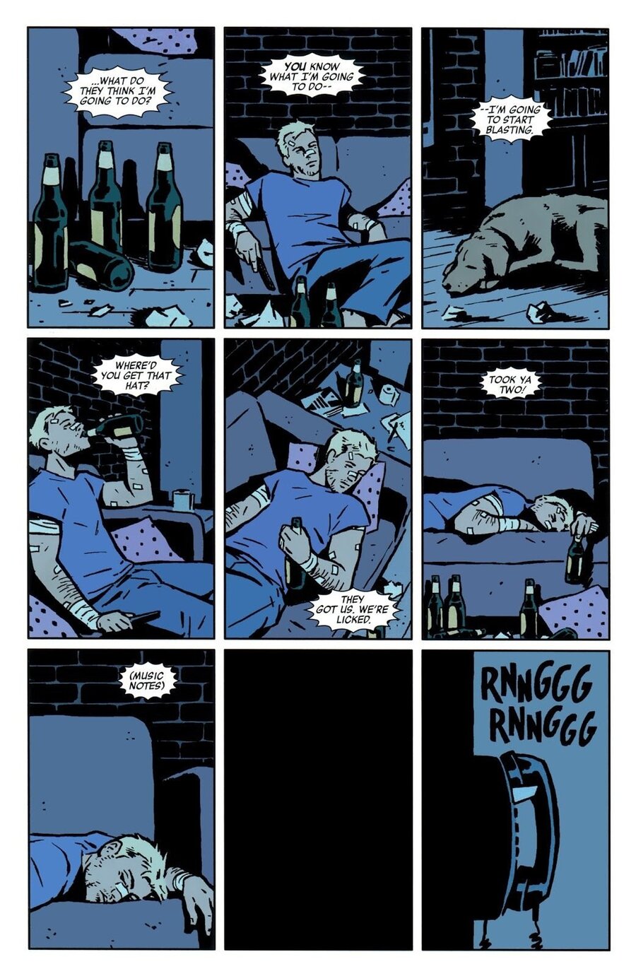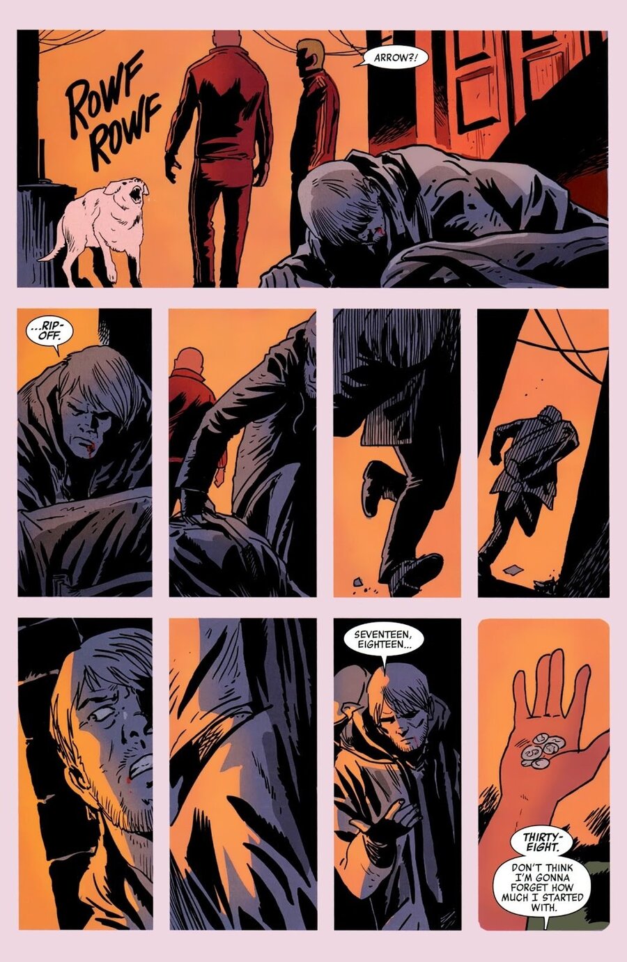Отдельного внимания заслуживает то, как Аджа работает с цветом. В Hawkeye палитра не выступает декоративным элементом и не стремится добавить сцене яркости. Она используется как инструмент организации повествования: каждая группа оттенков выделяет отдельный фрагмент истории, обозначает переход, настраивает на нужное восприятие события. Цвет работает как навигация — он не просто сопровождает рисунок, а помогает собирать последовательность действий в цельную структуру.