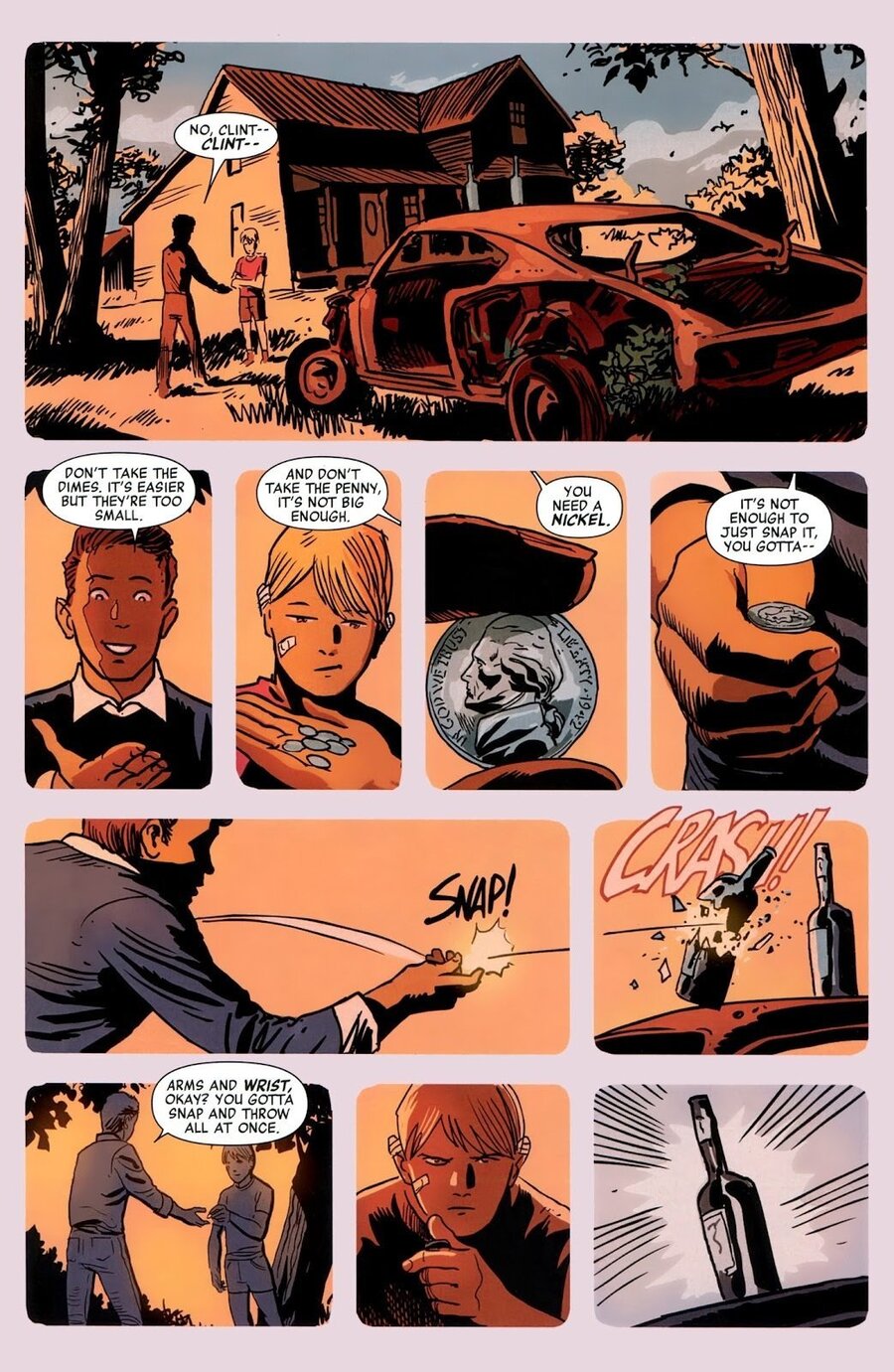 Наконец, ключевое отличие — отношение к повтору. В классических сериях повтор панелей почти не встречается: каждый кадр должен быть уникальным и впечатляющим. В Hawkeye повтор используется намеренно, как способ усилить структуру: один жест, одно движение или одна деталь могут появляться в нескольких соседних панелях, что создаёт устойчивый темп.