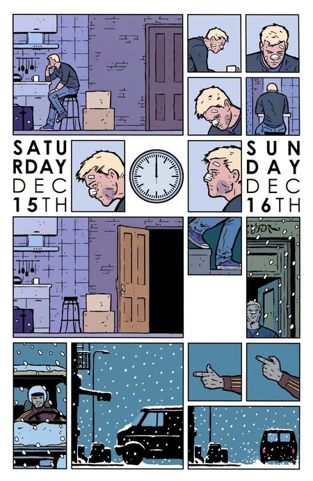 На этом фоне подход Дэвида Аджи в Hawkeye выглядит осознанным противопоставлением. Он использует сетку не как техническую рамку, а как основу визуального языка. Панели чаще всего ровные, повторяются по форме и размеру, создают стабильный ритм и выстраивают спокойную навигацию. Если в Avengers ритм страницы определяется динамикой сюжета, то у Аджи ритм задаётся заранее — сеткой. Она структурирует сцену даже до того, как в ней появляется действие.