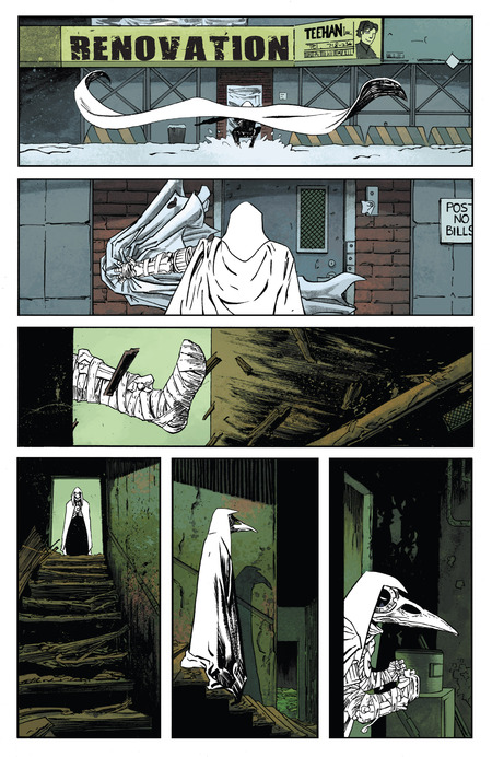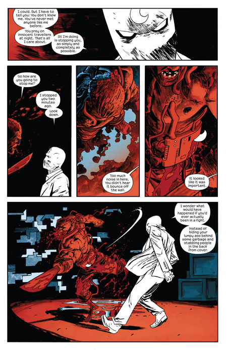Похожая тенденция появляется и в Moon Knight (Declan Shalvey, 2014). Хоть и стиль визуально отличается, но повторяющиеся структуры, сдержанные палитры и акцент на чистых формах показывают, что минималистичный подход укрепился в эстетике Marvel. Здесь присутствует та же логика: меньше декоративных элементов, больше внимания к темпу, композиционным блокам и читабельности сцены.