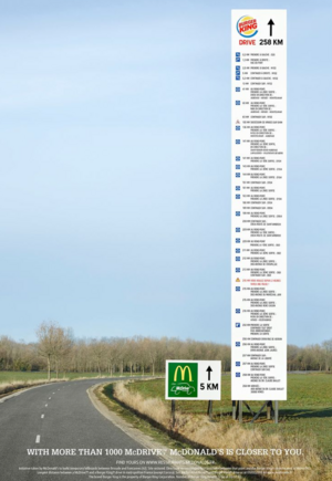 Реклама с мальчиком в Германии, билборд в Брюсселе («король или как король»), билборды во Франции (5 км до McDrive, 258 км до Burger King)