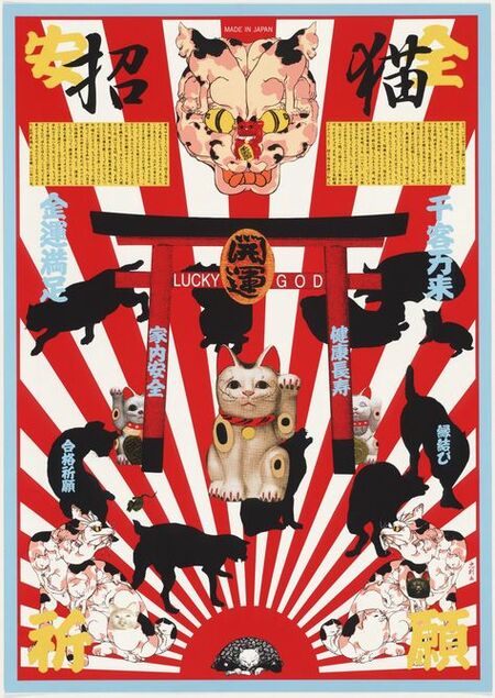 Таданори Ёкоо считается первым представителем японского поп-арта. Истоки его визуального языка — в детских впечатлениях: яркие ярлыки на товарах в лавке родителей, коллекционирование карточек мэнко с героями и самураями.