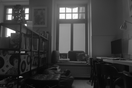 Тихая аудитория устроена иначе: рабочие столы, компьютеры, полки с книгами, мягкий пуф у окна, уголок с подушками за книжным шкафом. И снова мы видим отсутствие жёстко закреплённой функции: кто-то читает, кто-то работает, кто-то спит после учебного дня и перед началом семинара в музее. Как бы ни выглядел интерьер, пространство окончательно определяется действиями тех, кто им пользуется.