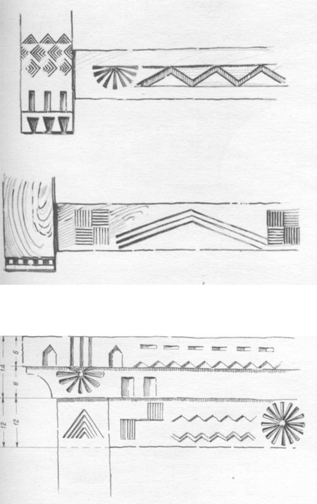 Рисунки справа — наличники в селе Большая Тальменка, Томская область, XIX век. Рисунок слева — наличник избы в селе Хайдуково, XIX век.