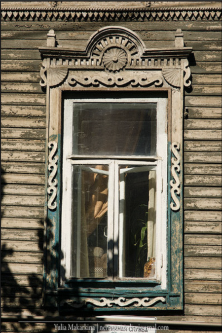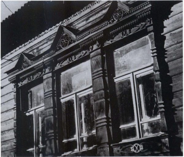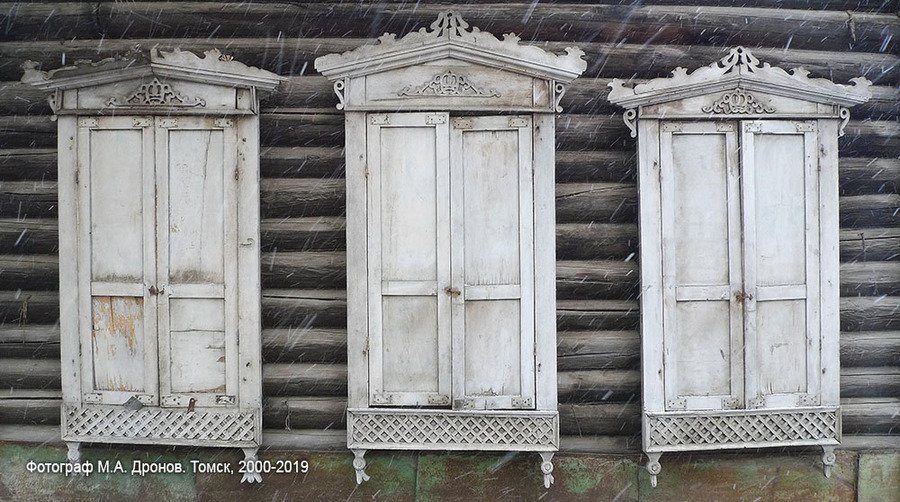 Справа — мотивы обработки окон в селах восточной сибири. Слева — наличники на доме по улице Октябрьская, 55. Томск. XIX век.