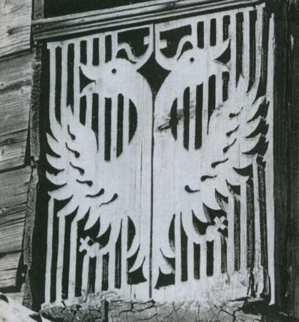 Слева — двуглавый орел на оном из домов в Костроме. Слева — мотив листьев и стеблей на одном из наличников Костромы. XIX век.