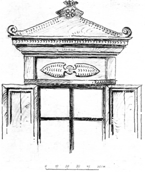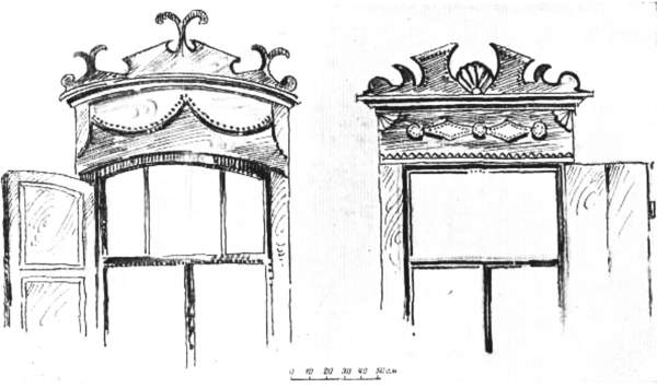 Справа — дом с наличниками в Чухломе, Слева — окно в селе Усолье Иркутской области. XIX век. В обоих примерах мотив пальметта прослеживается в сандрике.