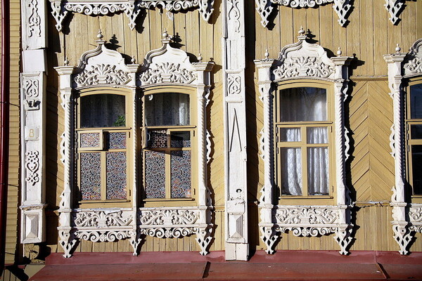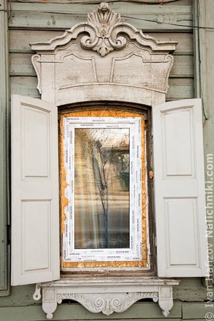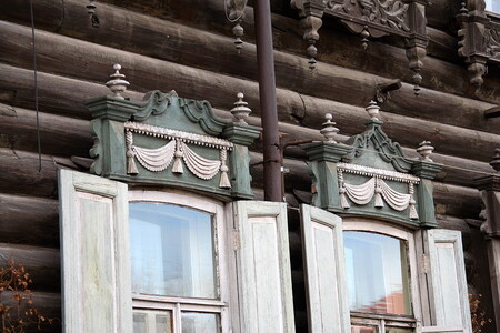 Наличники в городе Иркутск, XIX век. В сандриках можно заметить характерный для города элемент сходящихся волют.