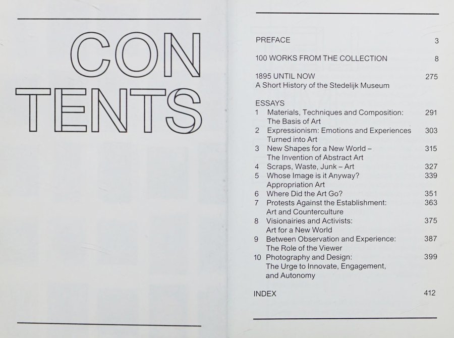 Интересно, как музей в два периода работал с каталогоми для экспозиций. Выпущенный в 2017 году каталог «Let me be your guide» (Позволь мне быть твоим гидом) начинается с обзора 100 работ из коллекции музея, при этом этот список выстроен хронологически: начинается со скульптуры Огюста Родена (1884–1886) и завершается дизайном книги Ирмы Бум (2016). В каталоге появляются фотографии перманентной экспозиции и временных выставок музея разных лет, а в конце — сборник из 10 эссе об искусстве, дизайне и социо-культурном контексте вокруг этих сфер. Логика каталога следует логике Stedelijk BASE: поддержана хронология, представлены работы признанных художников и дизайнеров из коллекции музея и обозначен культурный контекст, в котором он существует.
