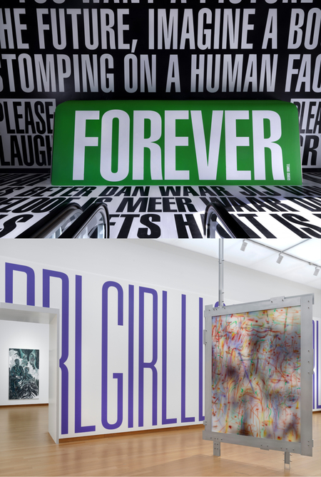 В помещении на первом этаже галереи располагалось продолжение выставки, в котором экспонировались работы с 1980 годов. Между двумя пространствами целую комнату занимала работа «Без названия (Прошлое, Настоящее, Будущее)» (2010) Барбары Крюгер. Работа заполняла всю комнату: на полу, стенах, потолоке располагались «конфронтационные, эмоционально окрашенные высказывания о том, что люди думают друг о друге»². Часть высказываний — это цитаты из книги «1984» Джорджа Оруэлла.
