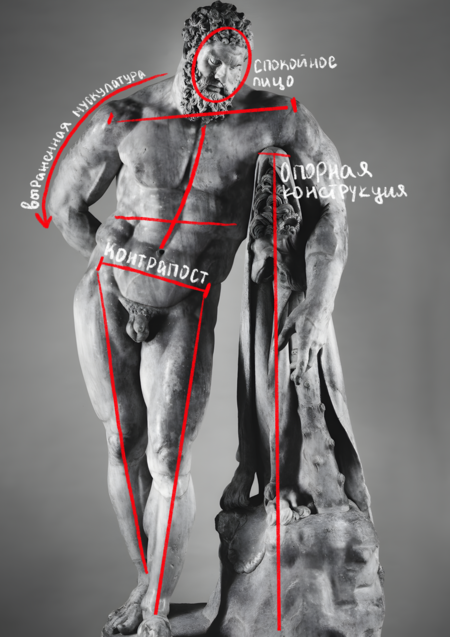 Тут всё работает на донесение идеи победы: решительная поза, развевающееся знамя, что аналогично подвигам Геракла.