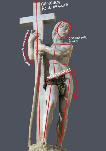 Христос здесь победитель, преодолевающий смерть, а не мученик, поэтому лицо его спокойно. Микеланджело сознательно создаёт Христа как нового Геракла. Он переносит в христианский контекст античный идеал «героя-победителя», причём делает это через пластику тела.