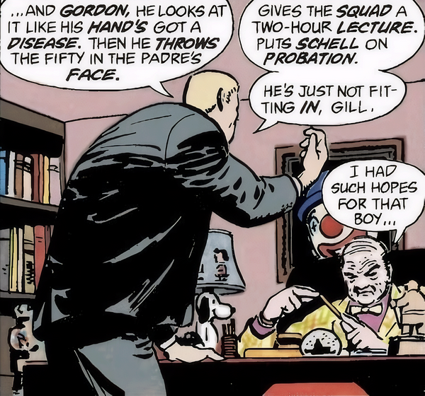 На фоне Лоэба и Фласса образ Джеймса Гордона развивается как этическая альтернатива существующему порядку. Гордон представлен как полицейский, сохраняющий стремление к общественному благу и действующий в соответствии с профессиональной этикой, несмотря на системное сопротивление.