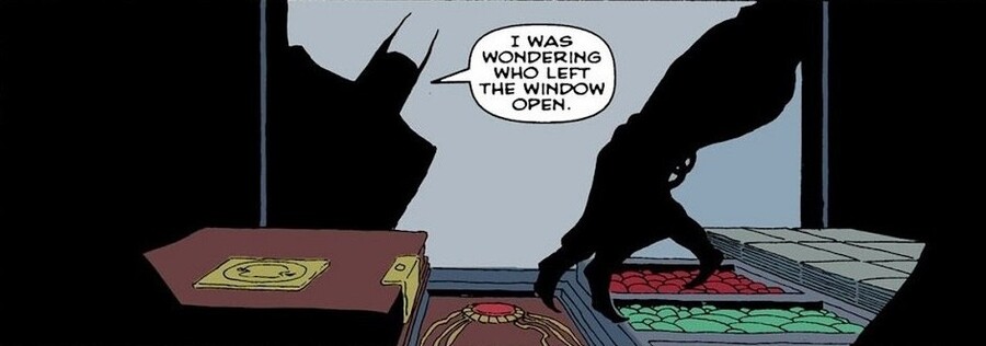 «Batman: The Long Halloween» #1, 1996, DC Comcis Бэтмен проникает в офис Кармайна Фальконе для того, чтобы вскрыть его личный сейф. Внутри он натыкается на Женщину-кошку.