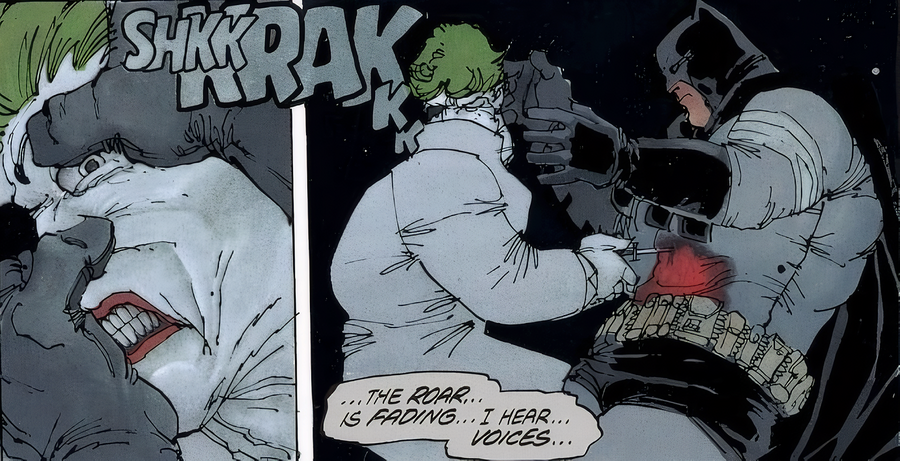 «Batman: The Dark Knight Returns» #3, 1986, DC Comics Бэтмен почти убивает Джокера, однако останавливается и отпускает шею злодея.
