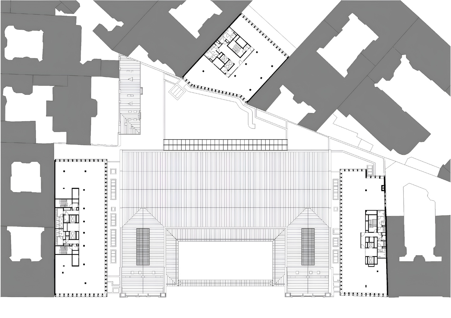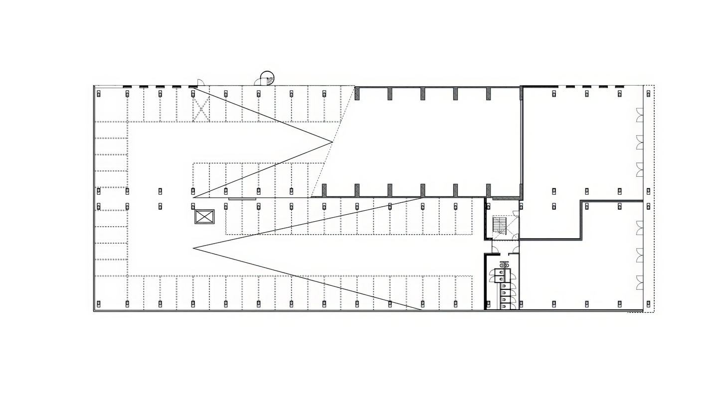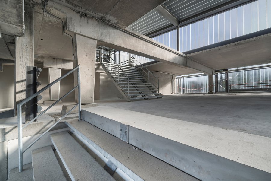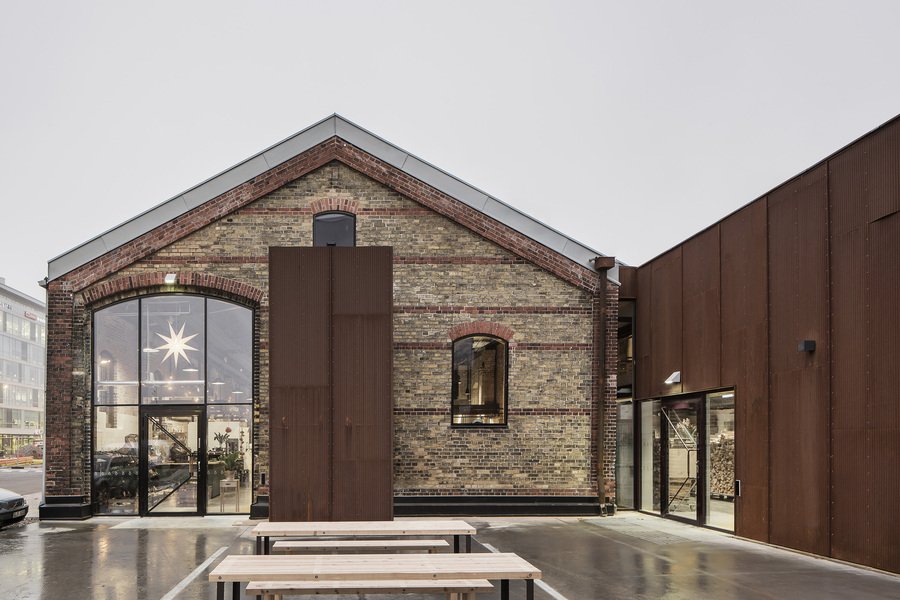 Архитекторы решили не восстанавливать склад в его прежнем виде, а переосмыслить его роль в городской среде. Они добавили новый объём, который формально повторяет силуэт традиционного крытого депо — двускатную форму, сохранив тем самым исторические кирпичные стены как главный элемент здания. А между старой кирпичной стеной и новой конструкцией оставили визуальный «шов» — узкую полосу света под крышей, подчёркивающую границу между историческим и современным слоями. Пристройку выполнили из волнистых стальных панелей с естественной ржаво-красной текстурой, напоминающей о железнодорожной инфраструктуре и индустриальном характере района.