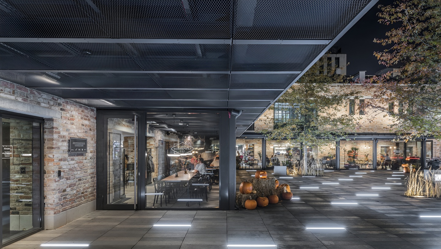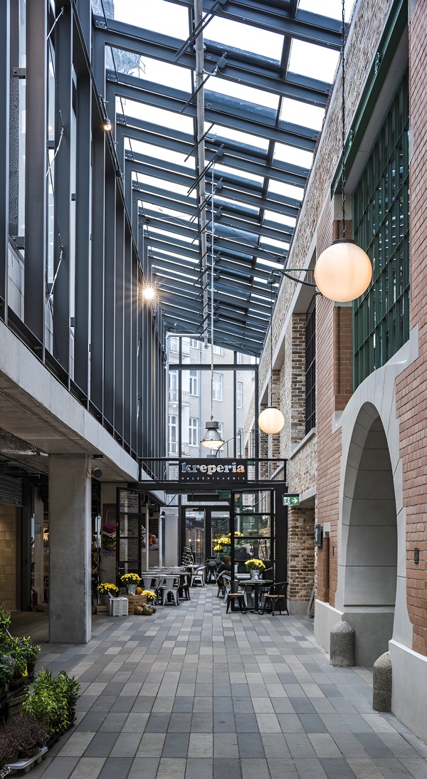 После реконструкции комплекс превратился в гастрономическую площадку, внутри которой разместились небольшие рестораны, продуктовые лавки и кафе. Пространство работает как многофункциональная гастрономическая среда: от продажи свежих продуктов до дегустаций, семейных обедов и неформальных встреч. Рядом оборудована наружная зона с уличной посадкой и временными киосками, что помогает сформировать площадку для активного общественного взаимодействия.