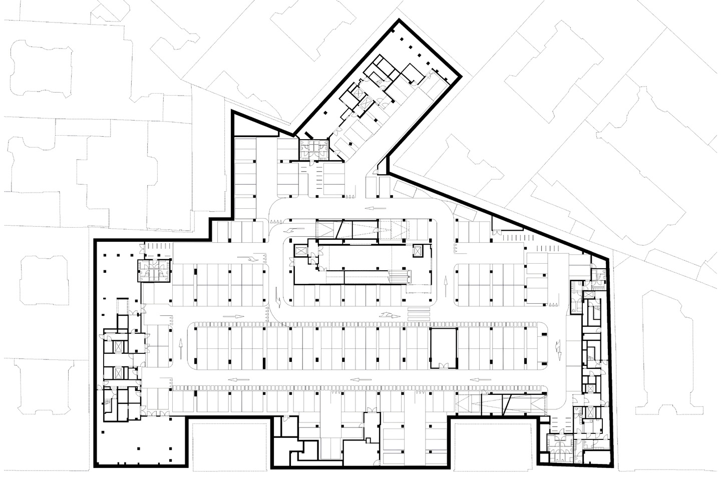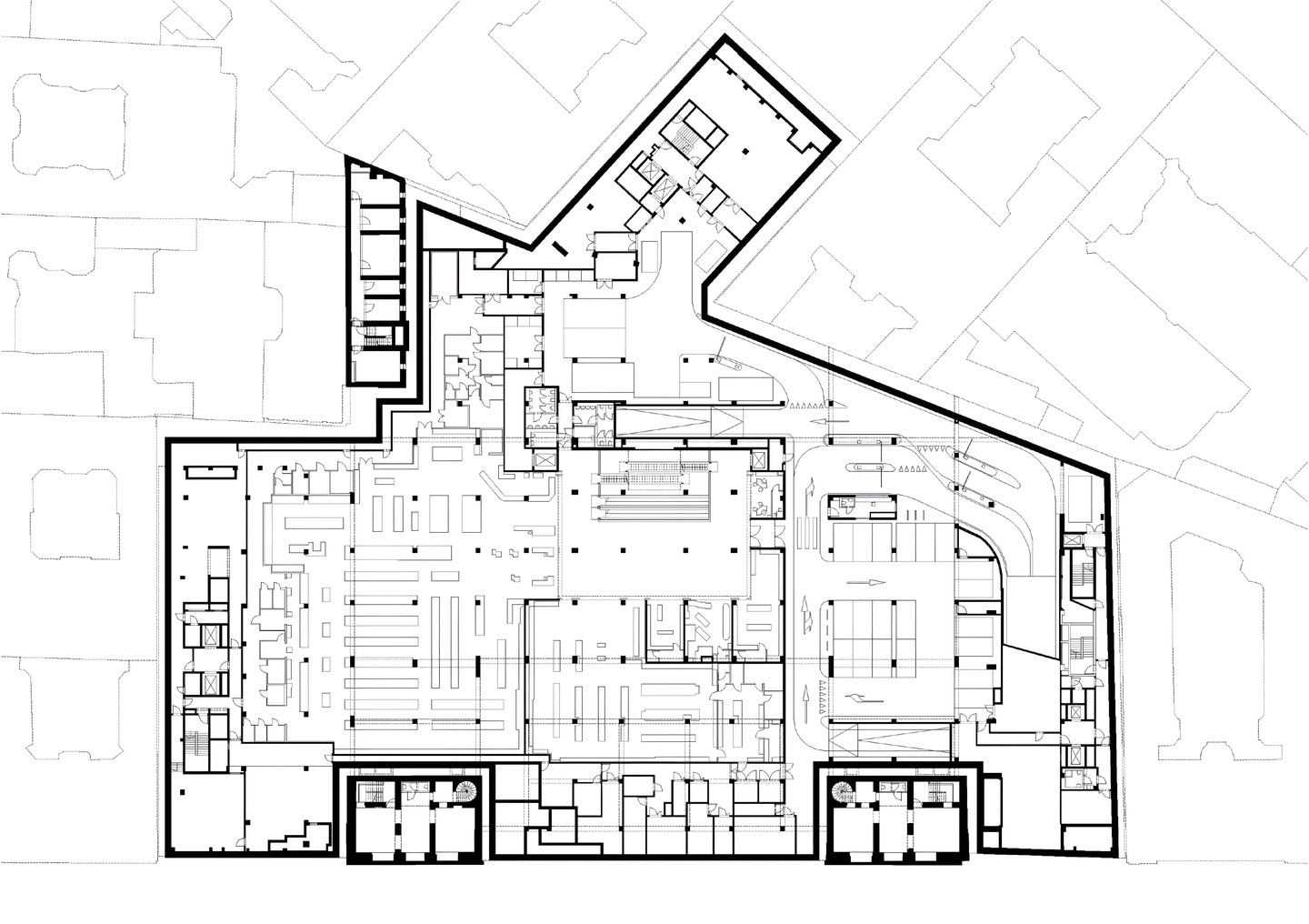 Первый этаж занимают 53 павильона с планировкой, перекликающейся с атмосферой традиционных рынков. Два верхних этажа отданы под рестораны и зоны отдыха, а на кровле размещено открытое пространство с вертикальным садом, свежие продукты из которого продаются на рынке.