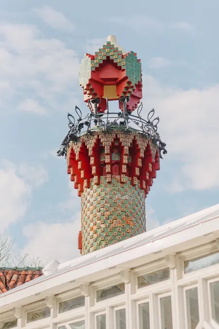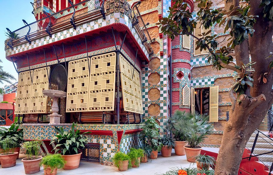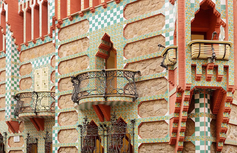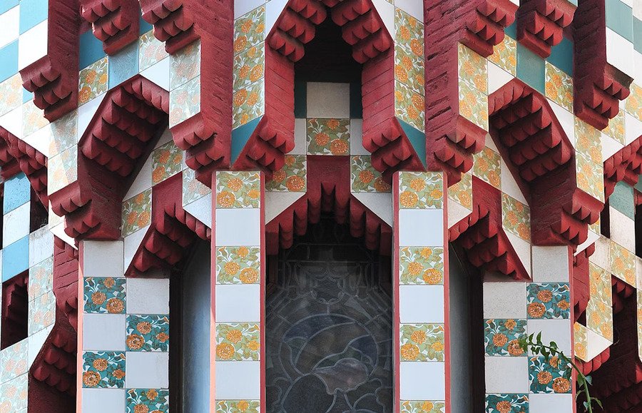 В Casa Vicens архитектор активно применяет керамику и кирпич, выстраивая фасад как рельефную, фактурную структуру. Полихромные плитки образуют не поверхностное украшение, а интегрированный в кладку модуль, создающий сложный рисунок стен. Таким образом Гауди переосмысливает декор, превращая его в конструктивно связанную часть фасада.