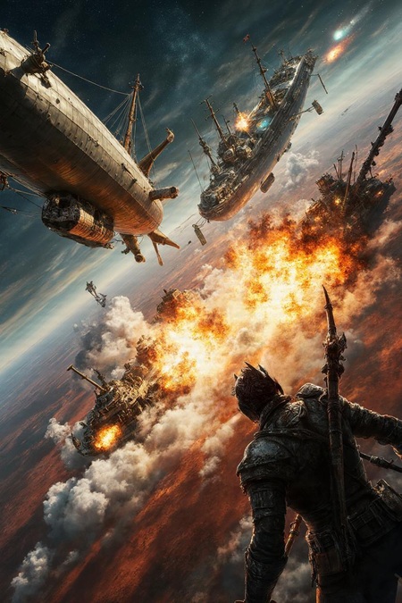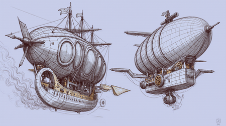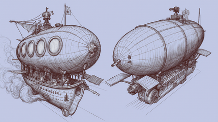 Межгалактический пиратский дирижабль в стилистике аэропанк / космоопера. Огромный воздушно-космический корабль, сочетающий формы классического парусного галеона и футуристического звездолёта. Корпус напоминает старинный дирижабль с обтекаемыми бронзовыми панелями, заклёпками, иллюминаторами и механическими элементами. Огромные аэрокрылья из ткани и металла, латунные трубы, паровые турбины и светящиеся реактивные сопла. На корпусе — символы пиратской коалиции и флаги путешественников. 1,2 — по оригинальному концепту 3 — только промт