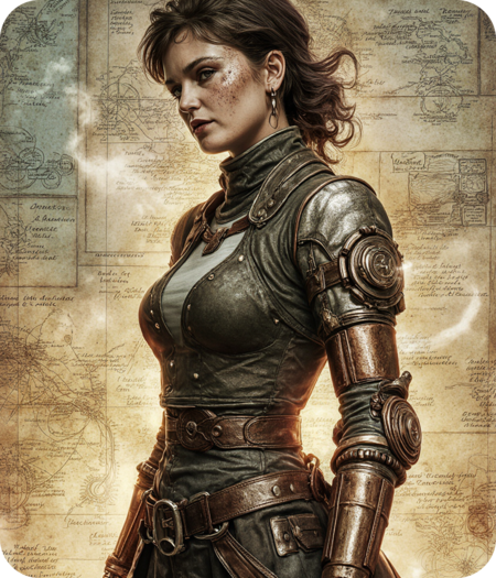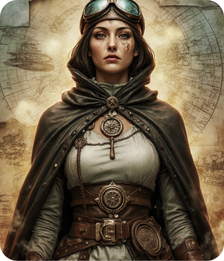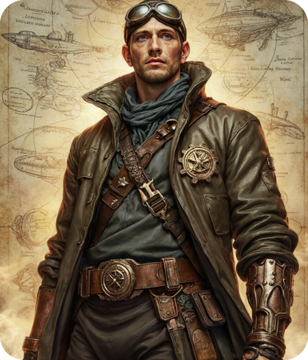 3 — Портрет персонажа — капитан космопиратского дирижабля в стиле аэропанк / стимпанк. Герой в полный рост по пояс, стоит на фоне страниц старинного дневника путешественников, с заметками, чернилами и схемами звездных маршрутов. На нём кожаный плащ, лётные очки, ремни с инструментами, латунные украшения и механический протез руки с шестернями. На груди — эмблема экипажа, на поясе — компас и карта звёздных ветров. Его взгляд решителен, лицо обветрено ветрами дальних планет. Вокруг лёгкий пар, отблески меди и света. Фон: фрагменты навигационного журнала — пожелтевшая бумага с чернилами, координатами и рисунками дирижаблей, поверх которых мягко падает свет. 4 — Портрет персонажа — капитана женщины космопиратского дирижабля в стиле аэропанк / стимпанк. Герой в полный рост по пояс, стоит на фоне страниц старинного дневника путешественников, с заметками, чернилами и схемами звездных маршрутов. На ней кожаный плащ, узкие очки, ремни с инструментами, латунные украшения. На груди — эмблема экипажа, на поясе — компас и карта звёздных ветров. Его взгляд решителен, лицо обветрено ветрами дальних планет. Вокруг лёгкий пар, отблески меди и света. Фон: фрагменты навигационного журнала — пожелтевшая бумага с чернилами, координатами и рисунками дирижаблей, поверх которых мягко падает свет.