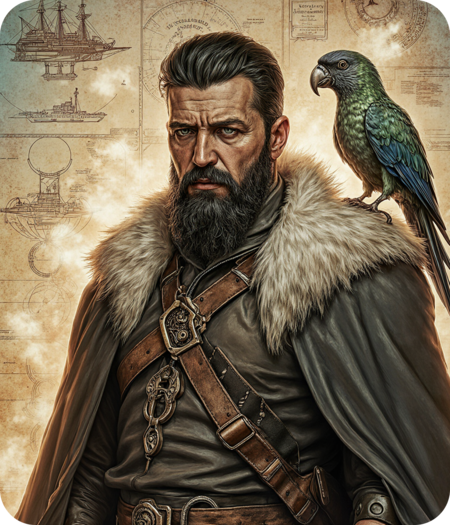 1 — Портрет персонажа — капитан космопиратского дирижабля в стиле аэропанк / стимпанк. Герой в полный рост по пояс, стоит на фоне страниц старинного дневника путешественников, с заметками, чернилами и схемами звездных маршрутов. Портрет мужчины-капитана пиратского дирижабля в стиле аэропанк / стимпанк. Корвин Дрей — харизматичный авантюрист, бородач с меховой оторочкой на воротнике и длинным плащом. На плече — попугай-механизм. Его взгляд решителен, лицо обветрено ветрами дальних планет. Вокруг лёгкий пар, отблески меди и света. Фон: фрагменты навигационного журнала — пожелтевшая бумага с чернилами, координатами и рисунками дирижаблей, поверх которых мягко падает свет. 2 — Портрет персонажа — капитан космопиратского дирижабля в стиле аэропанк / стимпанк. Герой в полный рост по пояс, стоит на фоне страниц старинного дневника путешественников, с заметками, чернилами и схемами звездных маршрутов.Портрет женщины-капитана-инженера космопиратского флота в стиле аэропанк / стимпанк. Рейн Холлоу — блестящий механик и стратег, её правая рука — сложный механический протез из меди и стали с вращающимися.Её взгляд решителен, лицо обветрено ветрами дальних планет. Вокруг лёгкий пар, отблески меди и света. Фон: фрагменты навигационного журнала — пожелтевшая бумага с чернилами, координатами и рисунками дирижаблей, поверх которых мягко падает свет.