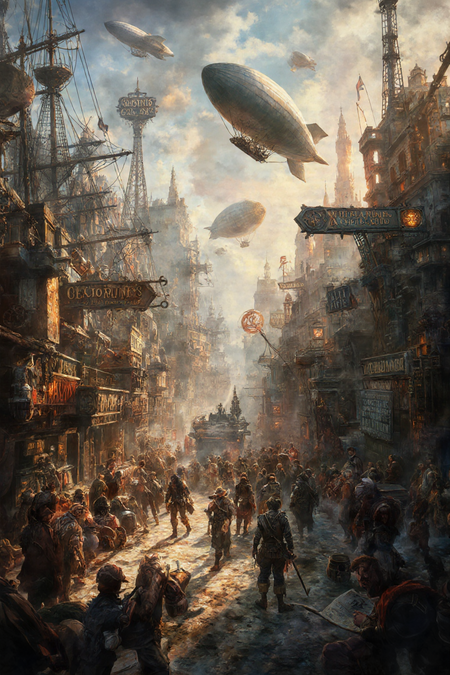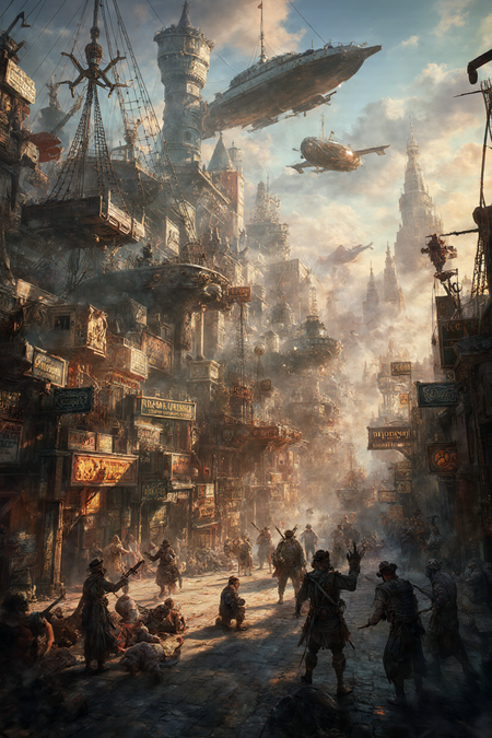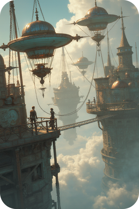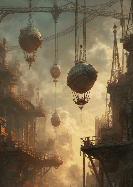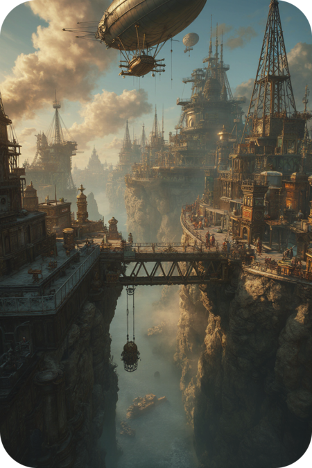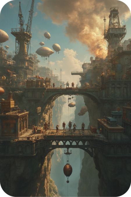 1/3 — Иллюстрация планеты-порта в стиле аэропанк / стимпанк, вид изнутри. Огромный космопорт, раскинувшийся по уступам скал и парящих платформам. В небе — десятки дирижаблей и воздушных судов, пар и дым клубятся над башнями и посадочными площадками. Пилоты и механики бегают по мостикам, кран поднимает грузовые контейнеры, паровые трубы излучают мягкий янтарный свет. Архитектура сочетает латунь, стекло и сталь, повсюду шестерни, вывески и огни. 2 — Город, висящий на гигантских цепях над слоем бурь. В небе — десятки дирижаблей, мосты между башнями, свечение небосвода, отражающееся в медных куполах. На переднем плане — площадка для посадки, механики и пилоты у парапетов. Паровые трубы, воздушные краны, свисающие канаты.