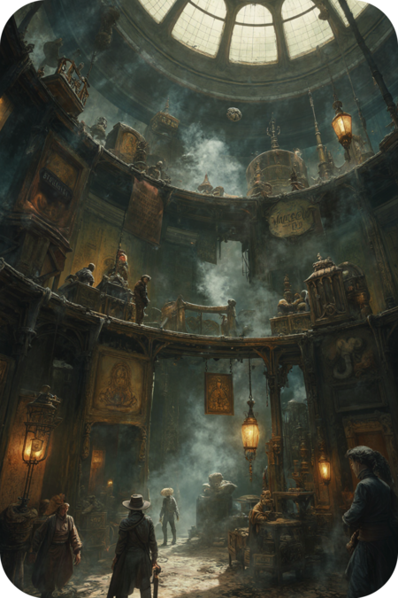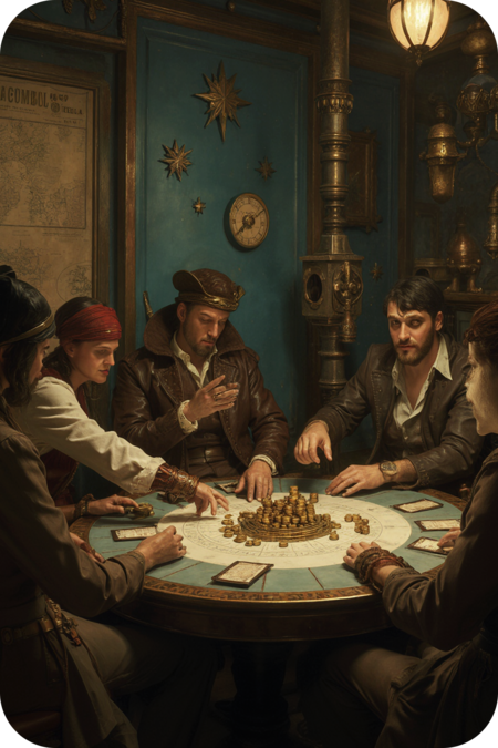 6 — Космо-пиратское казино на борту дирижабля или космического галеона, парящего в звёздном пространстве. В центре — игровой стол, на котором лежат кости и фишки, окружённые картами. За столом силуэты космо-пиратов разных рас с бронзовыми и кожаными аксессуарами, показывающие азарт игры и ставки из собранного лута.