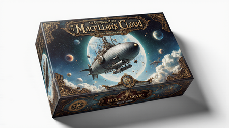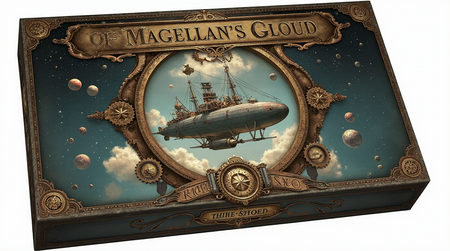 1,2 — Объект: коробка настольной игры с оформлением в стиле аэропанк / стимпанк / космоопера. На обложке изображён величественный космический дирижабль-галеон, парящий среди облаков эфира и звёздных орбит. На заднем плане видны далекие планеты и сияние звезды. Вверху или по центру расположен логотип «Кампания Магелланова облака» в латунно-золотом шрифте с эффектом гравировки и лёгким контровым свечением. По краям — декоративные элементы: компасы, шестерёнки, орбиты, маршруты. Сцена: реалистичный мокап коробки настольной игры в студийном освещении. Коробка стоит под углом (¾ view), видна лицевая сторона и боковая грань. Освещение — мягкое, направленное сверху и сбоку, подчёркивающее металлические отблески и текстуру картона. Фон — белый или светло-серый матовый, без отвлекающих деталей, чтобы акцентировать внимание на коробке.