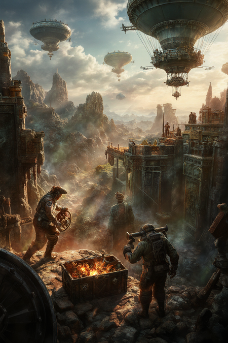 На платформе космопорта стоят пираты и механики — в кожаных плащах, с шестерёнчатыми ранцами, очками и паровыми инструментами. Один из офицеров держит карту звёздных ветров, другой подаёт сигнал посадки. Позади них — величественные башни, подвесные мосты и купола космопорта, украшенные лампами и вымпелами. В воздухе клубится дым, пар и искры, вокруг витает чувство приключения.
